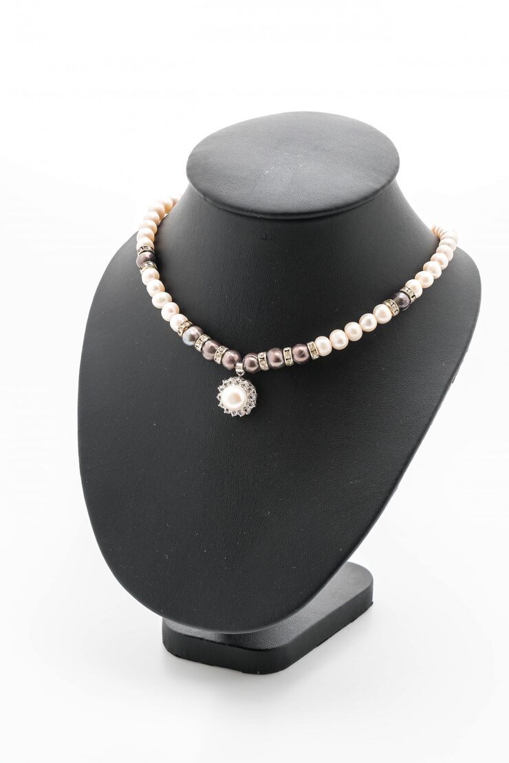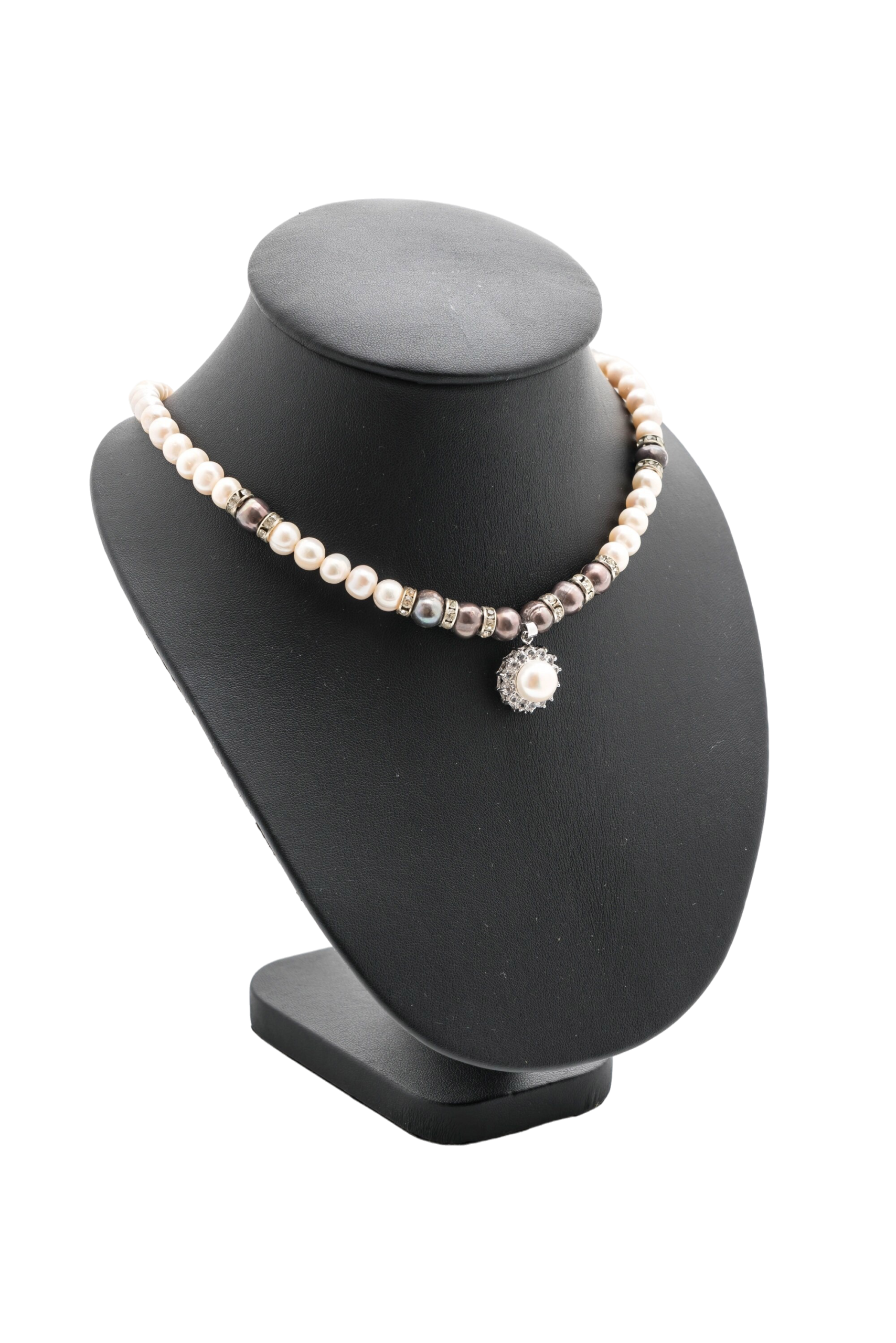 This item is a pearl necklace with a crystal or diamond pendant, featuring white and darker accent beads, displayed on a jewelry stand. It appears to be a type of choker or princess-length necklace due to its length.